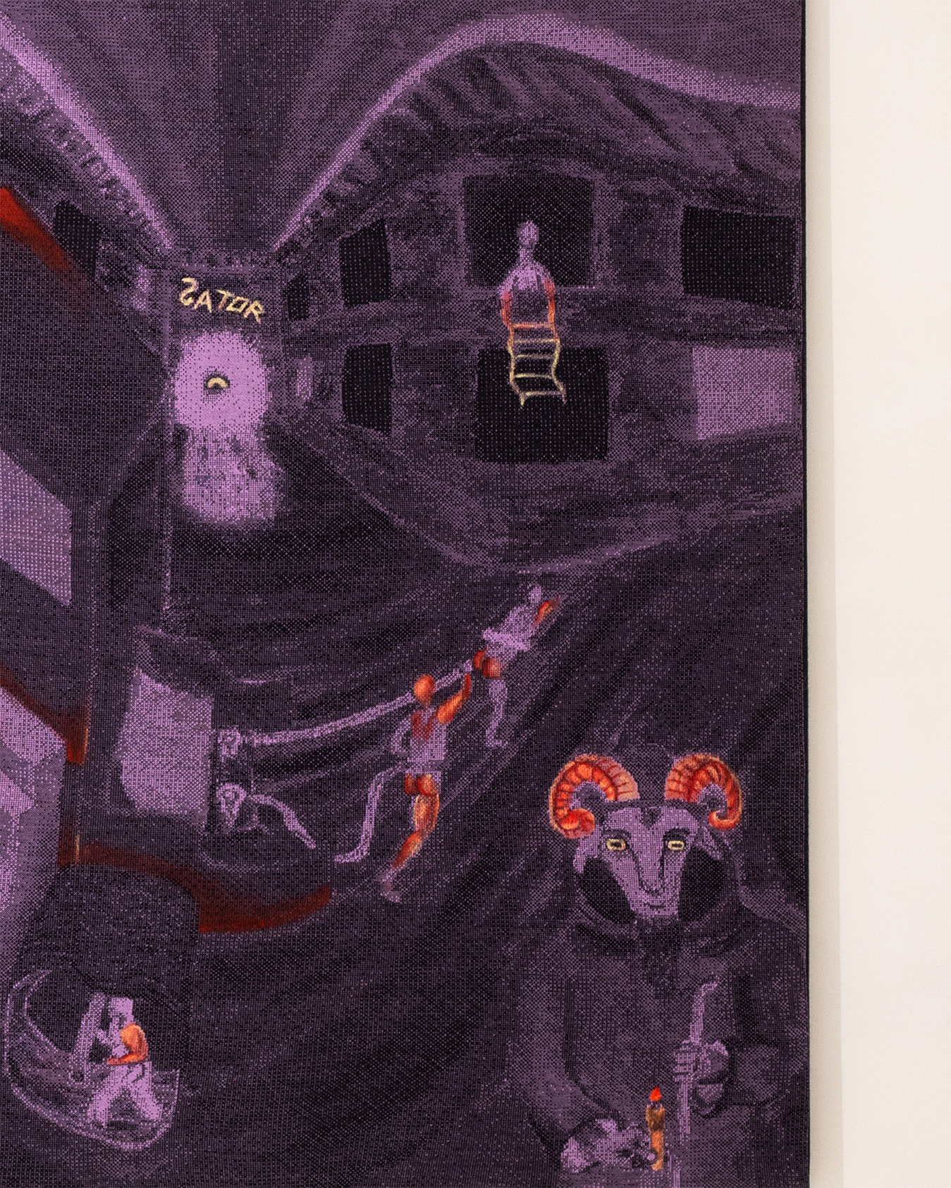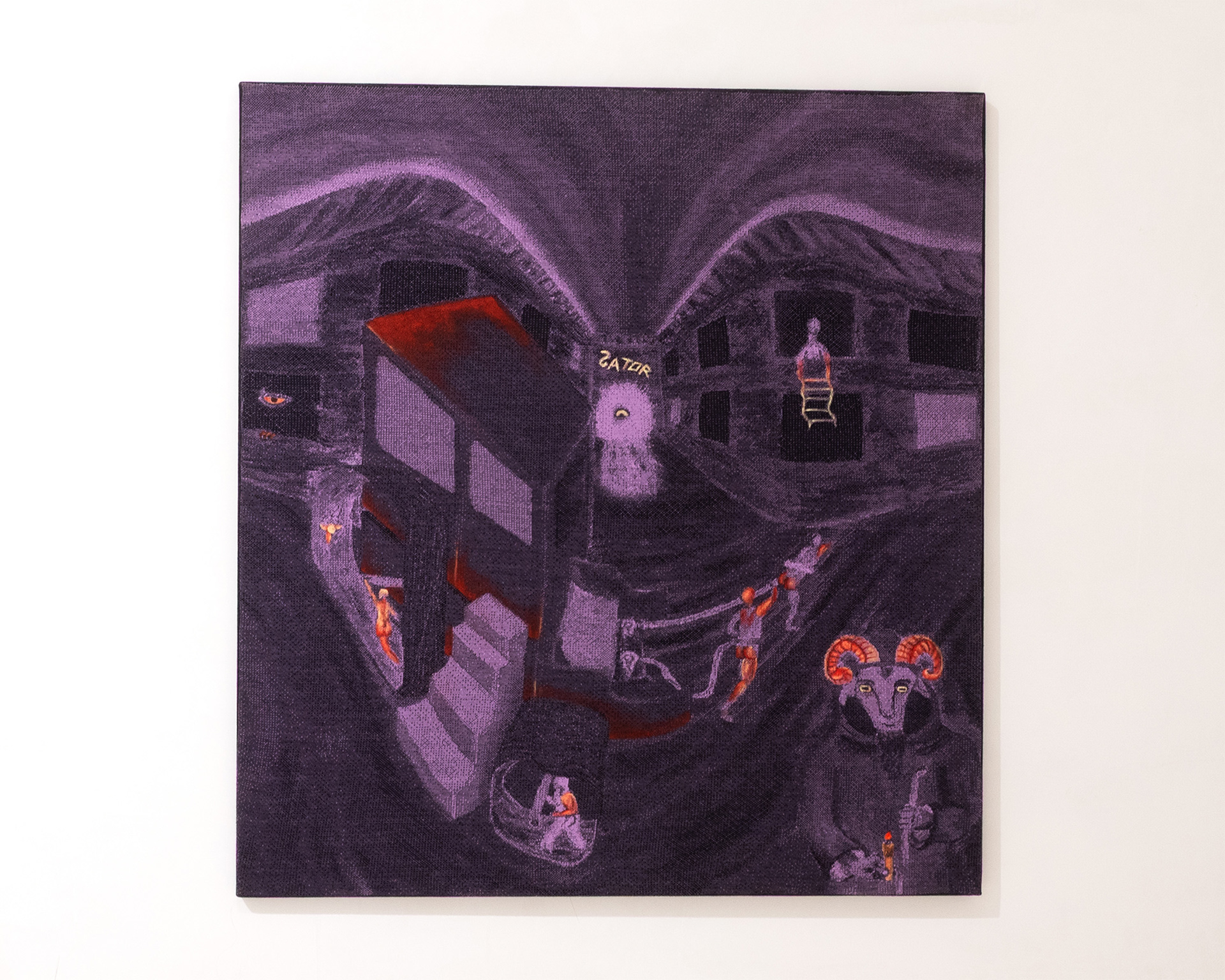 Tra i due palazzi distorti vi è una strada che termina con una porta dalla quale sbuca un occhio, sopra di essa vi è una scritta che dice “Sator” ovvero “Dio”. Il titolo del quadro “Opera rotas” è un rimando al quadrato magico che recita la frase” “Sator Arepo Tenet Opera Rotas”. Queste parole hanno un’origine molto antica (probabilmente Pompei 80d.c.) e per tanto ci sono diverse ipotesi su quale sia il significato effettivo, ma la caratteristica principale della frase è quella di essere completamente palindroma. Alcune delle traduzioni recitano “Il seminatore guida con cura le ruote” e “Dio guida e controlla ogni opera del creato”. Ho scelto di riferirmi a questo per dare un titolo all’opera, perché a mio modo di vedere racconta l’inversione dei ruoli del seminatore e della ruota. Il titolo è quindi “Opera Rotas” ovvero la stessa frase spogliata del soggetto “Sator” come a voler rappresentare l’assenza della ragione applicata sull’oggetto.